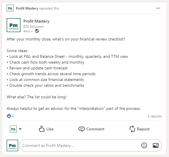After the month ends and your financials are ready, what should you do with them? Answer that question and you have your own version of an MFR. This is your time to step back from the day-to-day, reflect on the financial trends, do some analysis, and course-correct your business.